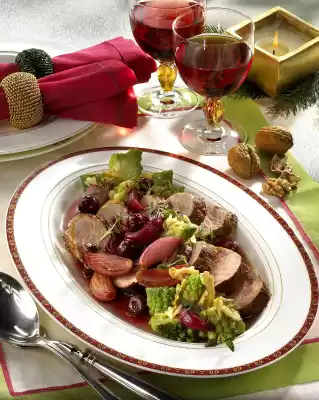 Clean and wash the Romanesco and divide into small florets. Cook in boiling salted water for 6-8 minutes. Drain. Remove the meat and wrap it in aluminium foil. Deglaze the meat with stock, wine and juice. Add thyme, boil down over high heat for about 3 minutes. Stir starch with 2 tablespoons of water until smooth, thicken stock. Add cherries and bring to the boil. Season to taste with salt, pepper and vinegar.
