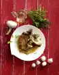 Heat the oil in a large frying pan. Brown the meat in it in portions. Season with salt and pepper and remove. Sauté the onions in the frying fat. Dust with flour and sauté briefly. Stir in 1/8 l water, cream, oregano and stock. Bring to the boil and simmer for about 5 minutes. Add meat and let it simmer for about 3 minutes