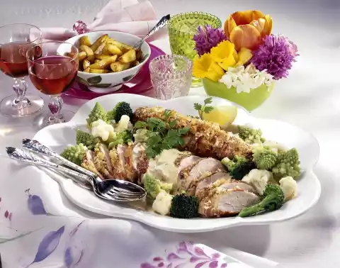 Remove the fillets from the sauce and keep warm. Heat the rest of the sauce again. Arrange pork loin, cabbage florets and sauce. Garnish with chervil and lemon wedge as desired. Roast potatoes taste good with it