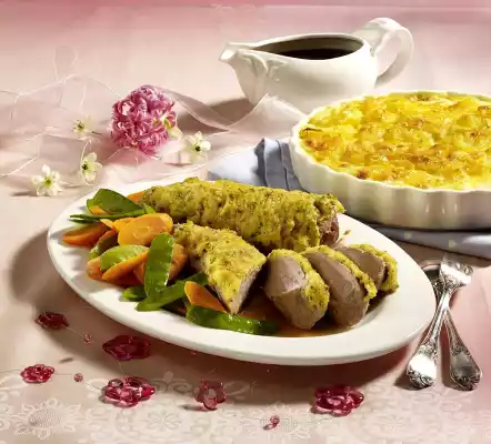 Bake in a preheated oven (fan oven 175 °C) for approx. 45 minutes. For the herb cap, wash parsley, shake dry, pluck leaves from the stalks and chop finely. Knead breadcrumbs, mustard, cream cheese, Gouda, parsley and egg.