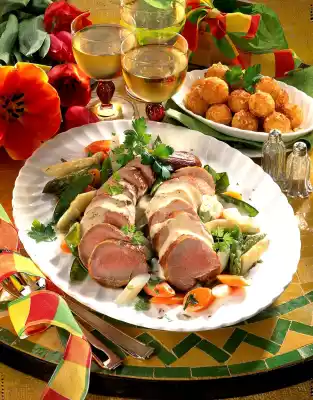 After 10 minutes, turn the balls once. Put asparagus and carrots in boiling salted water and cook for 12-15 minutes. Add sugar snap peas a little later and cook for about 10 minutes. Wash parsley and chervil, dab dry and chop except for something to garnish. Drain the vegetables. Melt the fat in a saucepan, toss the vegetables and herbs in it. Keep warm. Wrap pork fillets in aluminium foil and let them rest for 5 minutes. Deglaze roast with vermouth, add stock and cream and bring to the boil. Stir in sauce thickener, bring to the boil again and season with salt and pepper. Cut pork fillets into slices and arrange on a plate with vegetables and sauce.
