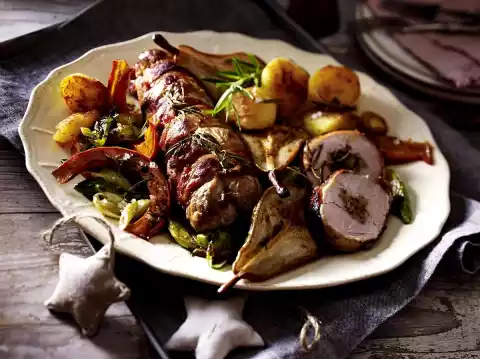 Take the fat pan out of the oven, arrange meat, vegetables, sprinkled with coarse salt, pears and potatoes on a plate. Garnish with the rest of the rosemary branch