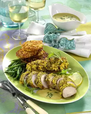 Drain the beans and toss with 20 g fat and the remaining parsley. Arrange pork fillets with some sauce, beans and Rösti on a large plate. Serve sprinkled with a slice of lemon and remaining tarragon and garnished.
