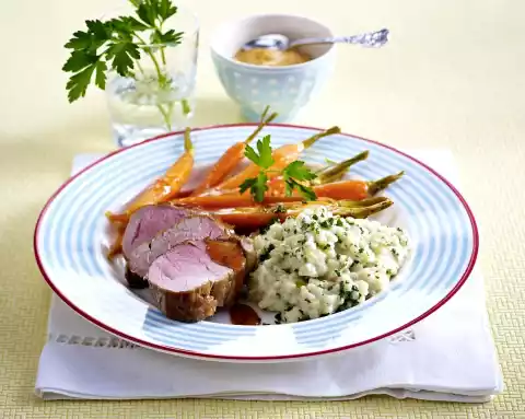 Wash the parsley, shake dry and, except for something to garnish, chop finely and stir into the risotto. Cut the meat open. Arrange meat, carrots in sauce and risotto on plates. Garnish with parsley.