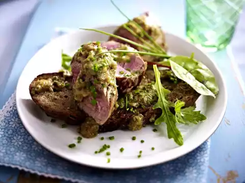 Bake in a preheated oven (electric cooker: 200 °C/ convection oven: 175 °C/ gas: see manufacturer) for 12-15 minutes. In the meantime, wash the chives, shake them dry and, except for a few stalks for garnishing, cut them into fine rolls. Cut the fillet open if necessary. Arrange slices of bread with meat on plates, sprinkle with chives. Garnish with chives and salad