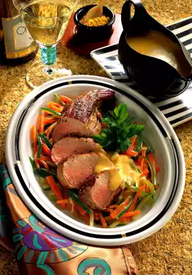 Whip the butter into the mixture bit by bit. Season to taste with mustard, salt and pepper. Leave the meat to rest for a while and cut open. Drain the vegetables, toss in the fat and arrange on a preheated plate with the meat and some sauce.
