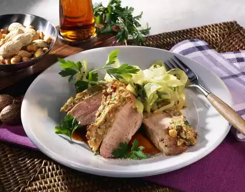Wash pork fillets and pat dry. Brown the meat in the remaining oil all around. Season with salt and pepper. Wash parsley, dab dry and chop finely, except for a little bit for garnishing. Coarsely chop the peanuts. Mix nuts, eggs, 2/3 of the parsley, breadcrumbs and 2 teaspoons of starch. Season with salt and pepper. Spread the mixture on the fillets and press lightly. Cook the fillets in the preheated oven (electric cooker: 200 °C/ gas: level 3) for about 12 minutes. In the meantime let the sugar caramelise slightly. Add veal stock, up to 1 tablespoon, and soy sauce and reduce by half. Season the sauce with Sambal Oelek.