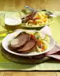 Spread the mixture on the fillets and press lightly. Cook the fillets in the preheated oven (electric cooker: 200 °C/ gas: level 3) for about 12 minutes. In the meantime let the sugar caramelise slightly. Add veal stock, up to 1 tablespoon, and soy sauce and reduce by half. Season the sauce with Sambal Oelek. Mix the remaining veal stock with the remaining starch, thicken the sauce with it and bring to the boil again. Add the fat and the rest of the chopped parsley to the vegetables. Arrange vegetables, sauce and pork fillet and garnish with parsley