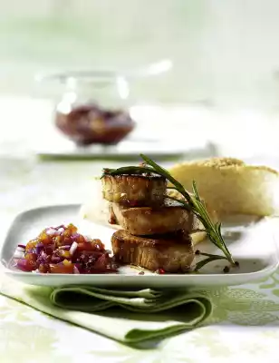 Wash the medallions, dab dry. Wash the rosemary and shake dry. Heat 3 tablespoons of oil in a frying pan, fry the meat in it vigorously on each side and fry on medium heat on each side for about 1 minute. Add rosemary shortly before the end of the frying time. Cut flat bread into 8 cake pieces. Arrange 3 medallions each sprinkled with pink berries and garnished with rosemary on 4 plates. Add 2 flat bread pieces and some chutney. Add the rest of the chutney extra