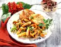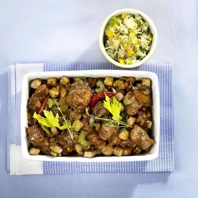 Clean, wash and cut spring onions into rings. Heat 1 tablespoon of olive oil in a pan. Fry the bell peppers and spring onions for 4 minutes. Mix the vegetables with the rice. Pour the meat into an ovenproof dish and grill under the grill of the oven for about 10 minutes. Pour rice into a bowl. Garnish meat with thyme twigs, celery green and chilli