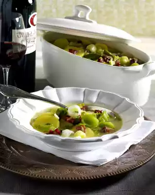 Heat the lard in a roaster. Fry the bacon and rind until golden brown. Add potatoes and braise for about 10 minutes. Add leek after about 5 minutes. Dust with flour and sauté for 1 minute.