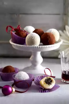 Form marzipan into approx. 30 balls, press flat. Wrap plums in it and roll them smooth between the palms of your hands. Dust about half of the pralines with icing sugar, roll the remaining pralines in cocoa.