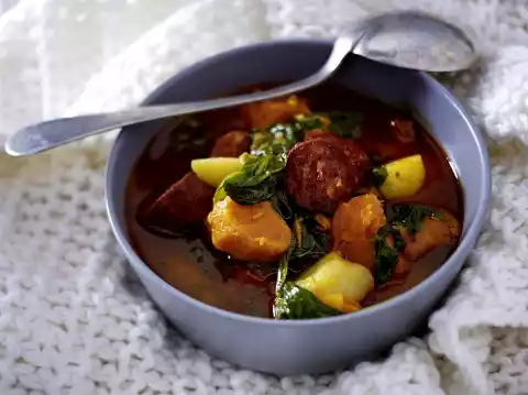 Add the frozen spinach to the soup for the last 15 minutes. Add sausage to the soup, heat. Season soup with salt, pepper and paprika.
