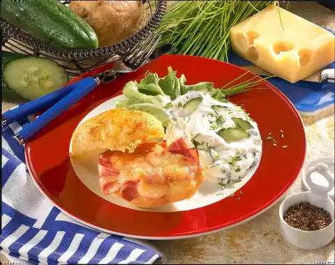 Coldly quench the potatoes, peel them and cut them in half lengthwise. Quarter the ham. Cut half of the cheese into pieces. Coarsely grate the rest of the cheese. Cover one potato half with ham and cheese pieces.