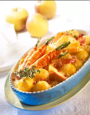 Bring to the boil, melt 3/4 of the cheese in it and season with salt, pepper and sugar. Wash apples, quarter them, remove seeds and cut them into slices. Finely dice ham. Put potatoes, apples, carrots and 3/4 of the ham cubes into a greased ovenproof dish.