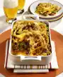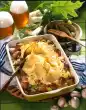 Pour sauce over it and sprinkle with the rest of the cheese. Bake in the preheated oven (electric oven: 200 °C/ gas: level 3) for 20-25 minutes. Sprinkle with remaining ham cubes and serve garnished with thyme as desired.