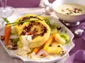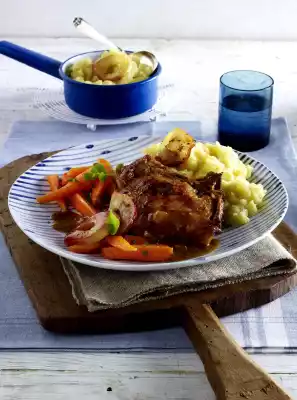 Remove the meat from the stock. Bring the stock to the boil, stir in the sauce thickener and bring to the boil again. Season to taste with salt, pepper and sugar. Put meat back into the sauce. Arrange carrots, puree and chops with sauce and apple slices on plates. Garnish with marjoram
