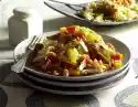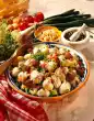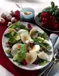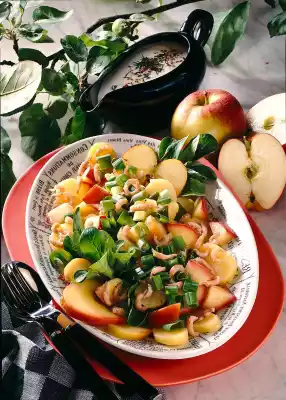 Cut the flesh into cubes. Bring vinegar to the boil. Season with salt, pepper and sugar. Add apple pieces and oil. Cut potatoes into slices. Pour marinade over them. Add spring onions.