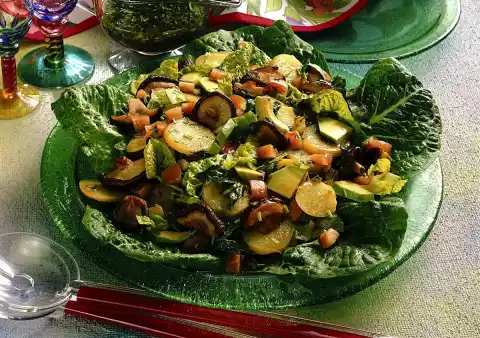 Pour the marinade over the salad ingredients. Line a bowl with the lettuce leaves and arrange the loosely mixed salad on top.
