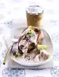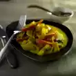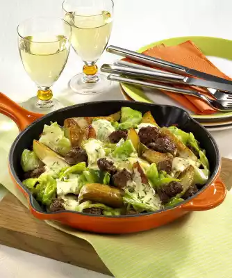 Wash the chives and cut into fine rolls. Warm up the sauce Hollandaise, stir in the chives. Add potatoes to the cabbage mince pan and mix. Pour sauce hollandaise over them.
