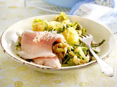 Cover potatoes with skin and cook in water for about 20 minutes. Clean, wash and quarter the pointed cabbage and cut into thin strips from the stalk. Peel and finely chop the onion.