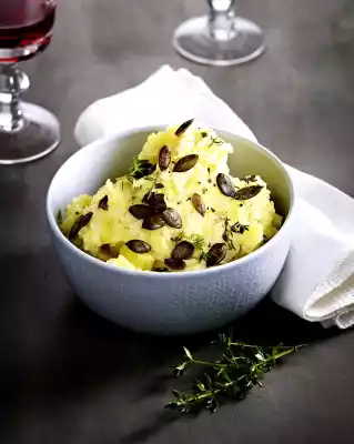 Season with salt, pepper and nutmeg. Wash thyme, shake dry and pluck finely. Sprinkle puree with pumpkin seeds and thyme.