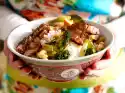 Stir in herbs, except for a little bit for sprinkling, and season with salt, pepper and nutmeg. Pour chanterelle sauce over the potatoes and sprinkle with cheese. Gratinate in a preheated oven (electric cooker: 200 °C/ convection oven: 175 °C/ gas: level 3) for approx. 30 minutes. Sprinkle the finished gratin with other herbs and garnish with parsley. Slice the sliced pork loin and arrange on a plate. Serve with a colourful salad