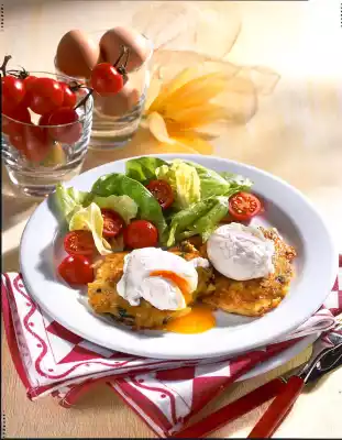 Season the remaining vinegar with salt, pepper and sugar. Whip the remaining oil into it. Sprinkle lettuce and cherry tomatoes with the vinaigrette and mix. Arrange 2 rösti with 2 poached eggs and salad on plates.
