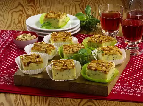 Oil a square springform pan (24 x 24 cm) and spread pine nuts on the bottom. Drain the potatoes, rinse with cold water and peel. Put potatoes into a mixing bowl and mash them with a potato masher. Mix cream and starch and bring to the boil. Stir herbs, cheese, butter and cream into the potato mixture. Season to taste with salt and pepper. Fill the potato mixture into the form. Chill for at least 2 hours, but better overnight. Use a knife to remove the edge of the mould, remove the edge of the springform pan and turn the terrine over.