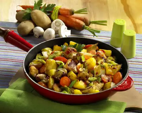 Add 1 tablespoon of oil to the frying fat. Fry the potatoes and carrots for 5 minutes. Add the mushrooms and white cabbage and fry for a further 5 minutes at high heat. Season with salt and pepper. Add chicken fillet and spring onions.