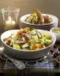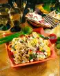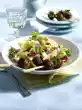 Wash chives, shake dry, put some stalks aside for garnishing. Cut the rest of the chives into fine rolls. Dice eggs, except for 2 slices for garnishing. Mix potatoes, mushrooms, eggs, chives and peas, fold in sauce. Leave the salad to soak well. Garnish meatballs and salad with egg wedges, chives and radishes