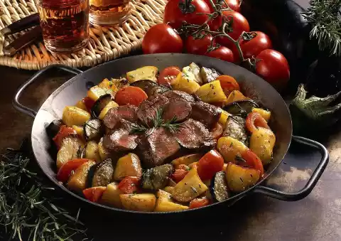 Add the tomatoes shortly before the end of the cooking time. Season with salt and pepper. Season the meat with salt, remove from the pan and let it rest for a while. Cut into slices and arrange on the potatoes. Garnish with rosemary