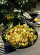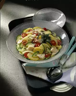 Wash the potatoes, boil for 20 minutes, rinse and peel. Wash fish fillet, sprinkle with lemon juice and dice. Put into boiling salted water and let it simmer for 5 minutes at low heat. Drain. Wash the cucumber, quarter it lengthwise and cut into slices. Wash and quarter cherry tomatoes. Peel and quarter the onion and cut into strips.