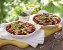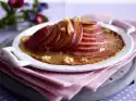 Fry the rosemary and shallots in the frying fat of the other pan for about 3 minutes over medium heat. Remove the rosemary. Add honey and caramelise slightly. Deglaze with wine and bring to the boil. Add shallots and braise in the closed pan for about 10 minutes until soft. Season with salt and pepper. Clean and wash spring onion and cut into rings. Cut the meat from the bones and cut into strips. Add meat juice to the shallots. Arrange gratin, meat and shallots. Sprinkle with spring onion and garnish with rosemary