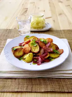 Heat the oil in a large coated pan. Fry the ham, potato and carrot slices over medium heat for about 8 minutes until golden brown. Season with salt and pepper. Finally mix in spring onions