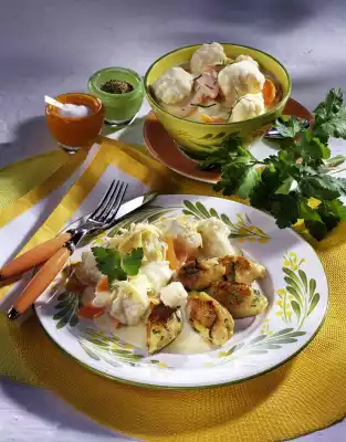 Wash the potatoes and cook for about 20 minutes. Clean or peel and wash the vegetables. Divide cauliflower into florets, cut carrots lengthwise in half and cut into slices. Cook the vegetables in 1/2 l boiling salted water covered for 8-10 minutes. Drain, collect the vegetable water and measure 3/8 l
