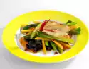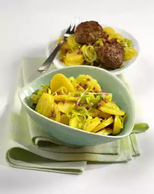 Clean and wash the leek and cut into fine rings. Fry the ham in a coated pan without fat. Sauté the leek briefly. Add 1/8 l water and vinegar, bring to the boil. Stir in broth and mustard and pour into a large bowl. Cut potatoes directly into slices in the marinade. Season with salt and pepper. Leave to stand for approx. 30 minutes