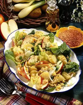 Drizzle apple slices with 1 tablespoon white wine vinegar. Clean, wash and drain the salad and cut into bite-sized pieces. Mix the remaining vinegar, 2 tablespoons of water, salt and pepper. Whip the oil into it. Cut the potatoes into slices. Mix with apples, lentils, spring onions and the marinade and arrange on a plate