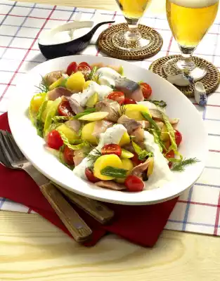 Leave 1 stalk of dill for garnishing. Pluck the rest of the dill and parsley from the stems and chop finely. Mix sour cream with herbs and salad cream, season to taste with salt and pepper. Wash, clean and halve the tomatoes. Clean and wash lettuce hearts, dab dry and cut into strips. Clean, wash and slice spring onions. Cut the maties into 2-3 cm pieces. Halve or quarter potatoes depending on size. Mix all salad ingredients together.