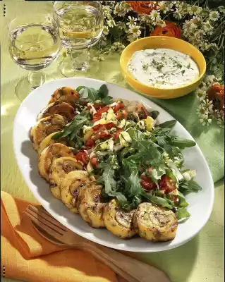 Mix the crème-fraîche, quark and chives, except for a little bit for sprinkling. Season with salt and pepper, place in a small bowl and sprinkle with remaining chives. Clean, wash and drain the rocket and chicory. Halve the chicory and cut into strips. Wash, dab dry and dice the tomatoes. Mix clear herb sauce, 3 tablespoons of water and olive oil. Add remaining onion cubes and tomatoes. For the potato cookies, stir the contents of the bag into 1/4 litre of cold water with a whisk. Fold in the mushrooms immediately and let everything swell for about 5 minutes. Form a thick roll (approx. 5 cm Ø) with moistened hands and cut into 10-12 slices.