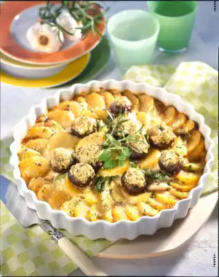 Mix 120 g cream cheese, cream, garlic and herbs. Season with salt and pepper. Pour the icing evenly over the potatoes and bake in the preheated oven (electric cooker: 200 °C/ gas: level 3) for 40-45 minutes. Mix the remaining cream cheese with the mushroom mixture and fill the mushrooms with it. After half of the baking time, spread the mushrooms on the gratin and sprinkle everything with parmesan. Ready to bake. Serve garnished with fresh herbs as desired