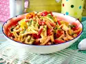 Wash the potatoes and cook covered for about 20 minutes. Quench, peel and let cool. Cook pasta in boiling salted water according to package instructions. Quench briefly and drain.