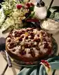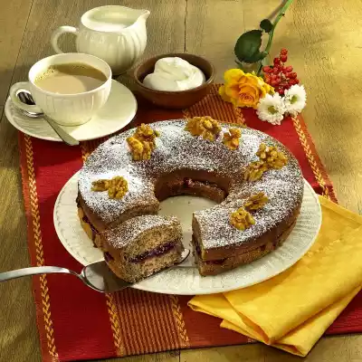 Caramelise 40 g sugar in a pan until golden. Add lemon juice and 50 ml warm water (caution: hot steam !!!) and boil down like a syrup. Add 25 g walnuts and mix with the syrup. Put the walnuts on a piece of aluminium foil coated with a little oil and let it cool down. Cut the cake in half horizontally. Stir the jam until smooth and spread it on the bottom ring. Place the upper wreath on top. Dust the cake with icing sugar and decorate with caramelized walnuts