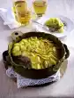 Preheat oven (electric cooker: 175 °C/circulating air: 150 °C/gas: see manufacturer). Cut the potatoes into slices, mix with spring onions, pears and bacon. Put them into a greased casserole dish. Pour sauce over it and sprinkle with cheese.