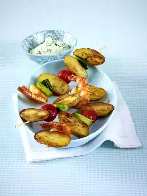 Clean, wash and chop the spring onions. Drain the potatoes, let them cool down briefly and cut in half. Alternately put shrimps, halved potatoes, spring onions and tomatoes on skewers.