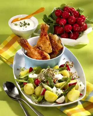 Put potatoes, asparagus, radishes and spring onions in a bowl. Peel and chop the onion. Heat the oil. Sauté onion in it. Add vinegar and lemon juice, bring to the boil. Season with salt, pepper and sugar.