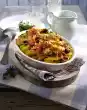 Drain the potatoes and collect the stock. Mash potatoes. Stir in 5 tablespoons of oil and so much stock until the mixture is creamy. Season with salt, pepper and nutmeg. Fold in garlic and rocket. Serve with the medallions. Sprinkle with pine nuts and garnish with olives and caper apples