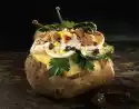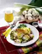 Wash the dill and cut finely, except for a little garnish. Mix the sour cream and eggs and season. Cut potatoes into thin slices