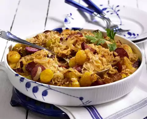 Fry the cabanossi, onions and potatoes for 5-7 minutes, remove. Add the sauerkraut to the pan and braise in the fat for about 5 minutes. Remove the sauerkraut from the pan, roughly mix it with the cabanossi, onions and the potatoes and place it in an ovenproof dish (24 cm Ø).