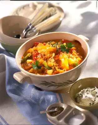 Clean, wash and cut the peppers into pieces. Peel and roughly dice the onion. Peel and wash the potatoes and also cut them into cubes. Peel garlic and press it through a garlic press.